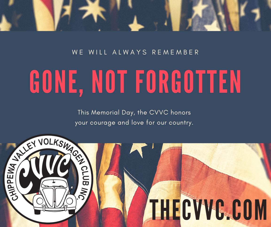 Memorial Day Today we remember. Share this: Click to share on X (Opens in new window) X Click to share on Facebook (Opens in new window) Facebook More Click to email a link to a friend (Opens in new window) Email Like Loading... Related Published by Chippewa Valley Volkswagen Club, Inc. (CVVC) The CVVC is a grassroots not-for-profit club for Volkswagen enthusiasts run by volunteer enthusiasts in the Chippewa Valley of Wisconsin, USA. View all posts by Chippewa Valley Volkswagen Club, Inc. (CVVC)