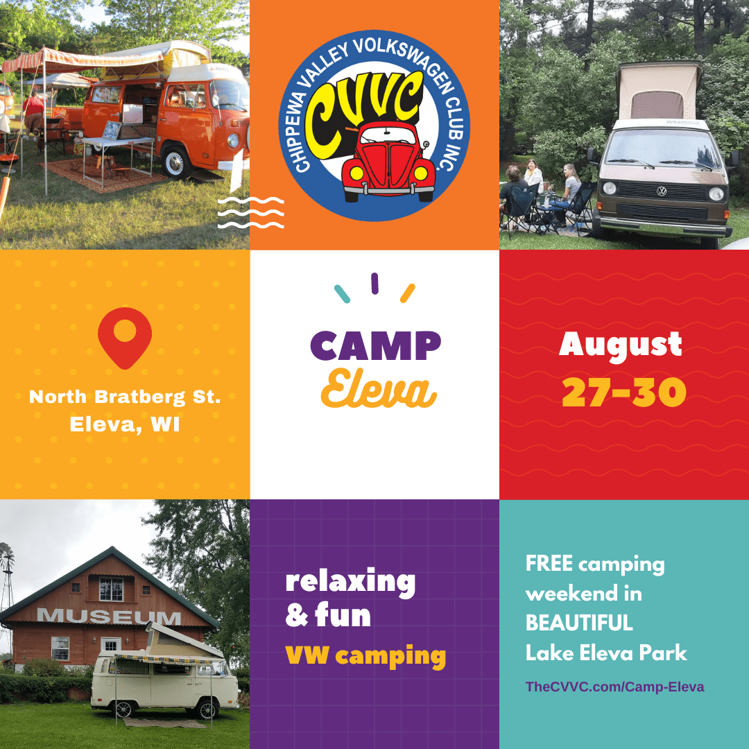 Excited to get out and use those VWs for what they were made for: CAMPING! Don’t worry– if you have a Volkswagen that was made for the road, you are welcome to tent it. Hope Camp Eleva is already on your calendar, but if it isn’t, plan to join us for this back-to-basics camping weekend at Lake Eleva Park in Eleva, Wisconsin, the last full weekend of August. Click here to learn more!