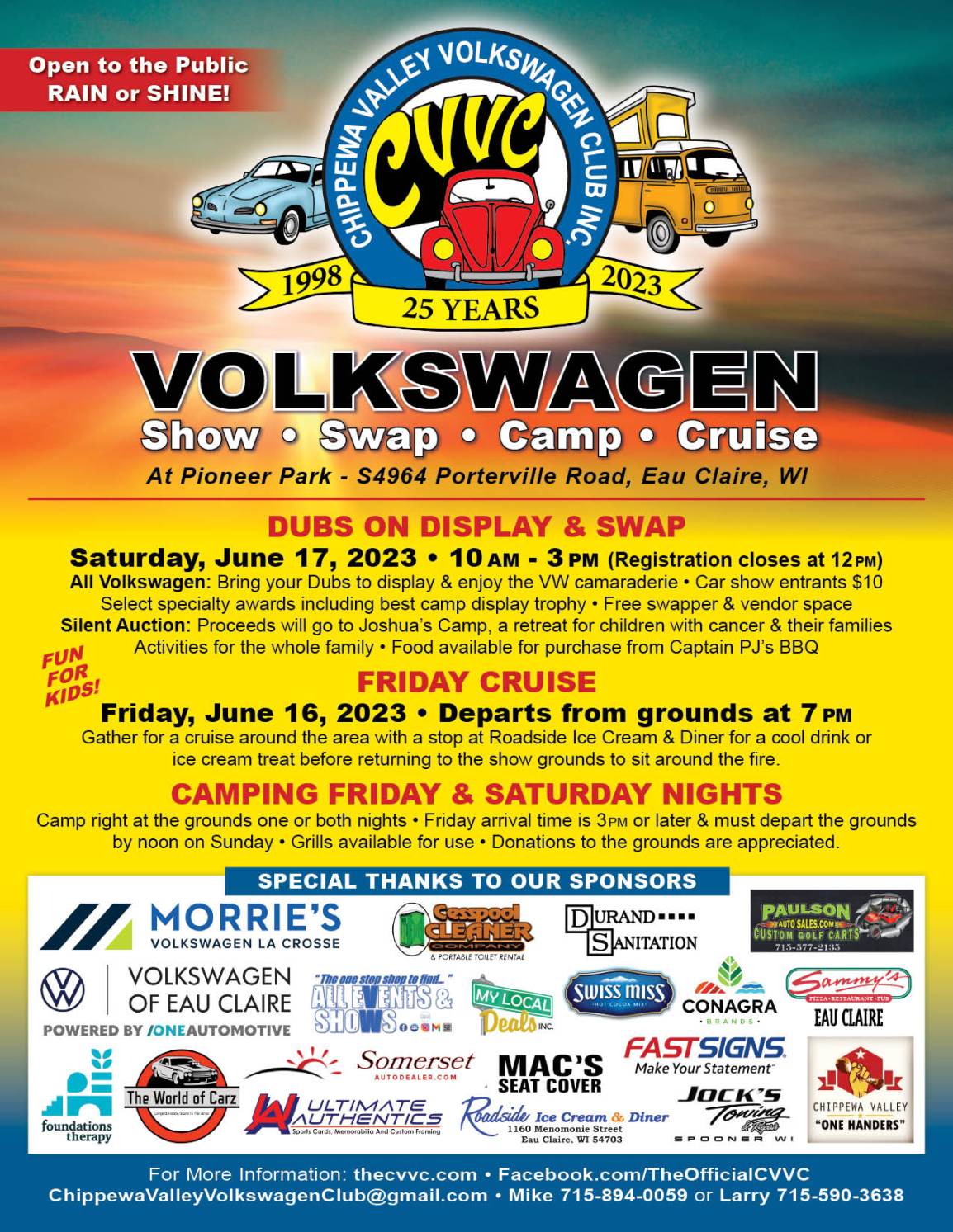 Thank you sponsors! We have AMAZING sponsors who support our VW addiction… Hope to see you at the show! Share this: Click to share on X (Opens in new window) X Click to share on Facebook (Opens in new window) Facebook More Click to email a link to a friend (Opens in new window) Email Like Loading... Related Published by Chippewa Valley Volkswagen Club, Inc. (CVVC) The CVVC is a grassroots not-for-profit club for Volkswagen enthusiasts run by volunteer enthusiasts in the Chippewa Valley of Wisconsin, USA. View all posts by Chippewa Valley Volkswagen Club, Inc. (CVVC)