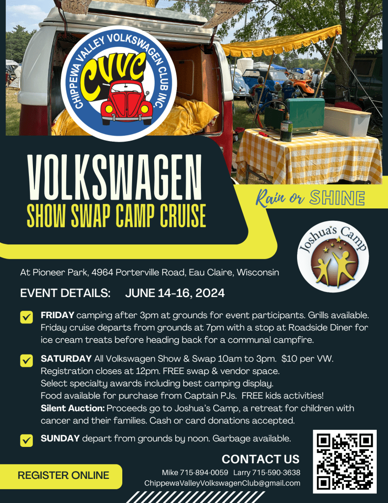 2024 All-VW Show! REGISTER HERE! Share this: Click to share on X (Opens in new window) X Click to share on Facebook (Opens in new window) Facebook More Click to email a link to a friend (Opens in new window) Email Like Loading... Related Published by Chippewa Valley Volkswagen Club, Inc. (CVVC) The CVVC is a grassroots not-for-profit club for Volkswagen enthusiasts run by volunteer enthusiasts in the Chippewa Valley of Wisconsin, USA. View all posts by Chippewa Valley Volkswagen Club, Inc. (CVVC)