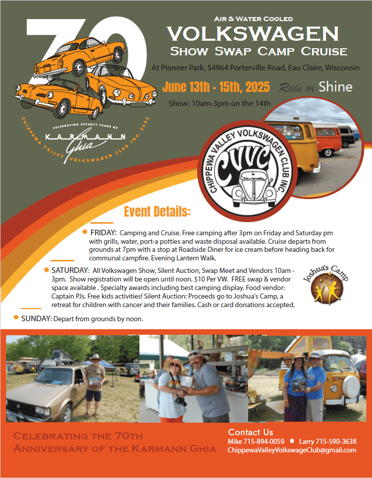 RAIN OR SHINE – Join us for The Chippewa Valley Volkswagen Club’s Show, Swap, Camp & Cruise June 13th – June 15th!