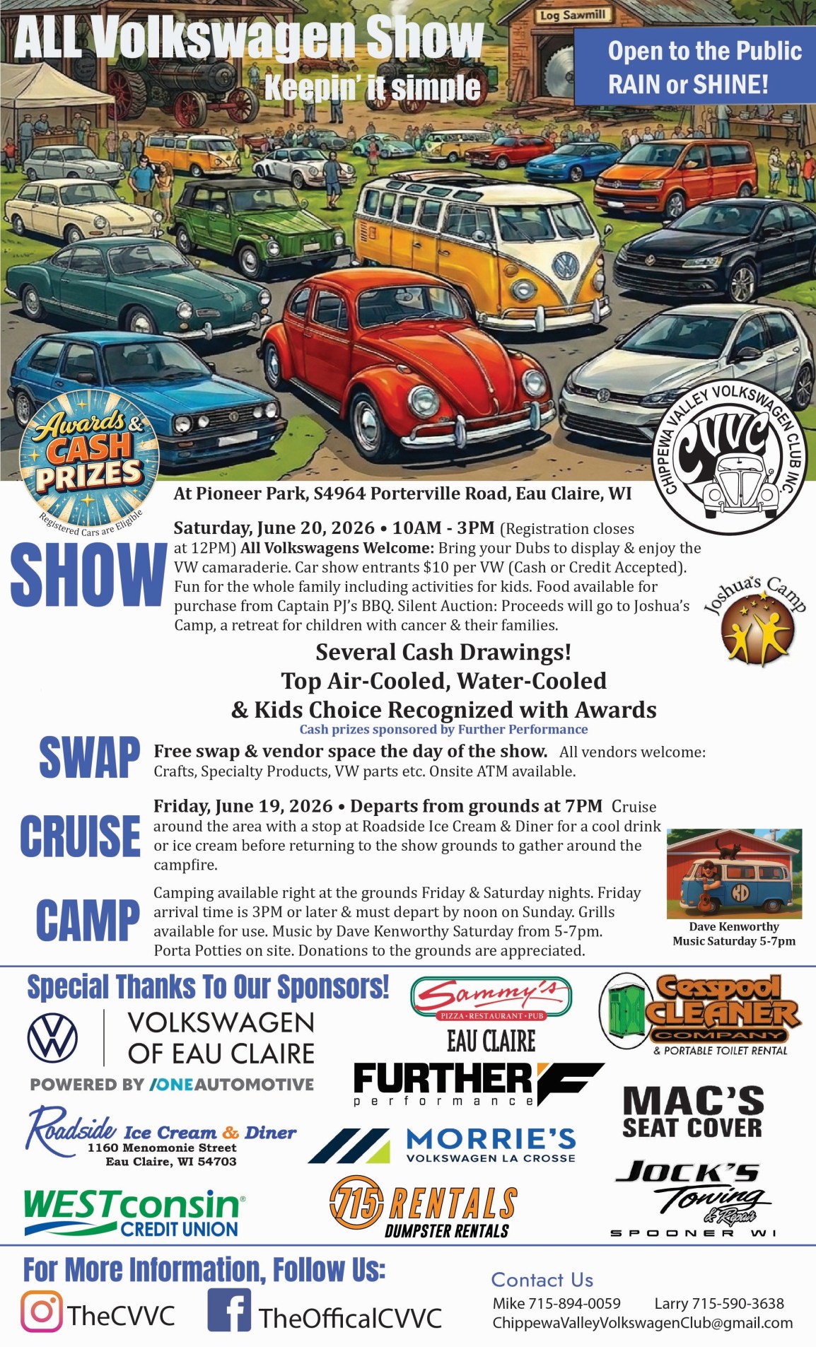 The Chippewa Valley Volkswagen Club is excited to invite everyone to the 2026 CVVC All Volkswagen Show! Join fellow VW enthusiasts for a relaxed, family-friendly weekend celebrating air-cooled and water-cooled Volkswagens.